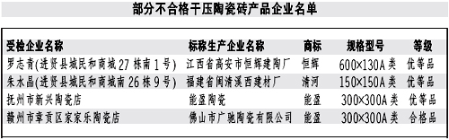 本报讯记者龚汉斌报道:近日,江西省质监局公布了近期对干压陶瓷砖产品进行省级产品质量监督抽查的结果。质监部门共抽查了51家生产企业生产的52批次产品,抽样合格率90.4%。抽查结果表明,本次抽查的陶瓷砖其放射性核素限量指标均达到了标准规定的要求;但仍有部分产品存在一些问题。 本次抽查的5批次不合格产品中,有1批次产品的破坏强度达不到标准规定要求,两批次产品的断裂模数指标达不到标准规定要求。强度性能指标不达标易造成产品达不到应有的承重能力,在使用中产生开裂、破碎或表面缺陷等现象,影响产品的使用寿命和使用性能。有4批次产品的吸水率达不到标准规定要求。吸水率不达标,将影响消费者的正常使用。 对本次监督抽查不合格的产品,省质监局将依法严肃处理。