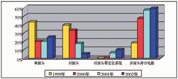 图1 所示从1999年到2002年(2002年的数据是由上半年数据推算而来)单探头、双探头、双探头带定位系统和多探头符合线路,四种不同核医学设备每年各种类型所占比例。可以看出。最为明显的是普通双探头在2002年仅仅占总数的5%,普通单探头占总数25%,多探头带符合电路系统占总数59%。普通双探头带X线定位系统占总数10%。可以看出单探头SPECT和多探头符合电路系统呈增长趋势,尤其以多探头符合电路系统更为明显。