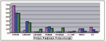图2 从2001年7月-2002年6月调研10家单探头用户、5家普通双探头用户和30家双探头可变角度带有符合电路用户临床检查类型的数据。为了便于比较,采用相对数的方法。可以看出对于单探头用户在临床主要用于骨扫描和甲状腺检查。对于双探头带有符合电路系统的用户,骨扫描46%、心肌血流灌注23%、符合电路10%、甲状腺9%、心肌代谢7%、GA-67为2%,其它(肾脏、肝等)3%。可以看出双探头符合电路系统最大的贡献是为临床开拓出20%新的检查项目,最为重要的是这些检查项目将成为主流临床检查。这可能是双探头(多探头)符合电路在国内急剧增加的主要原因。